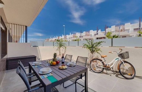 Moderno apartamento con gran terraza en planta baja de un edificio de dos plantas. El apartamento con piscina comunitaria está situado en un nuevo barrio de Mil Palmeras, a tan solo 43 km del aeropuerto de Murcia-Corvera y a 58 km del de Alicante-El Altet. El mar se encuentra a menos de 300 metros y la preciosa playa de arena de Mil Palmeras a 500 metros. En la parte comunitaria de la urbanización los huéspedes podrán disfrutar de la piscina.