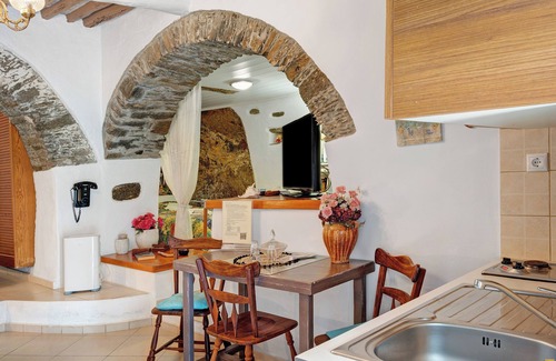 Situada en la parte más baja de Ioulida, la capital de Kea, la casa consta de dos habitaciones separadas por arcos tradicionales. La casa está construida dentro y alrededor de una roca, lo que le da un carácter muy pintoresco. Debido a la forma en que está construida, la habitación es fresca durante los calurosos días de verano, y bastante cálida durante las frías noches de invierno. Para refrescarse y calentarse hay aire acondicionado. Hay un cuarto de baño, así como una cocina totalmente equipada, un gran armario, una nevera y una televisión para que se sienta como en casa. La vista desde la habitación es como mínimo impresionante, ya que se puede ver todo el pueblo de Ioulida, que está construido anfiteatralmente sobre dos colinas opuestas.
