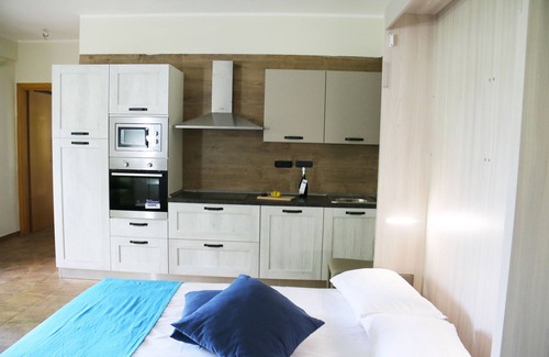 El apartamento está equipado con horno eléctrico, vitrocerámica, horno microondas, nevera-congelador, lavavajillas, máquina de café espresso, tostadora. Toda la vajilla necesaria está presente, como ollas, cubiertos, platos, vasos, cuencos y tazas. El salón está organizado para seis personas, con una mesa y sillas.