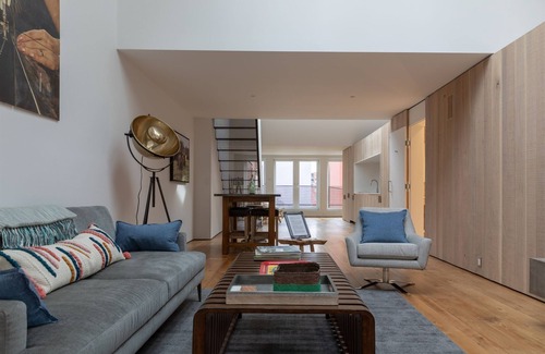 Tenga en cuenta que las ventanas y tragaluces no tienen cubiertas. Si bien este es un espacio del tercer piso, permite que la luz natural ingrese al espacio. El dormitorio tipo loft mantiene la privacidad debido a la colocación de las ventanas. Esta es una caminata en el tercer piso, así que tenga en cuenta que todos los huéspedes deben tener la capacidad de subir dos tramos de escaleras para ingresar al apartamento, pero no tendrá vecinos arriba ya que este es el último piso del edificio.