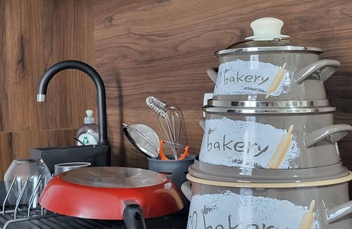 - **Cocina**: Una cocina completamente equipada con todo lo que necesitas, incluido un horno, una estufa de superficie plana, refrigerador, cubiertos, vasos, platos, ollas y una tetera.