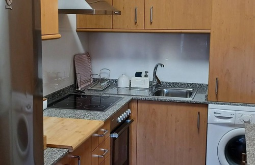 Apartamento de dos habitaciones, salón, cocina americana y un baño. Con garaje amplio de uso privado y ascensor hasta el piso en tercera planta con espectaculares vistas. En la parte trasera tiene una amplia terraza (60 m2) con barbacoa y cómoda mesa para 6 personas. Apartamento muy cuidado y con todo lo necesario para la vida tanto en el baño, como en la cocina y en las habitaciones.