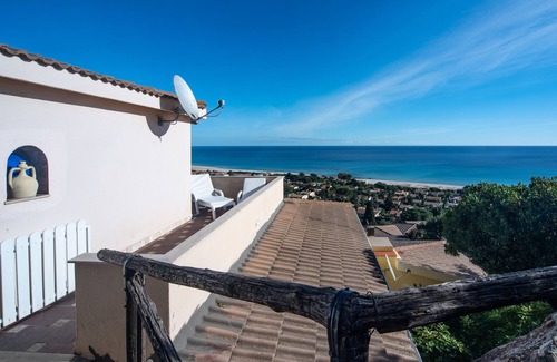 La casa está ubicada en un pequeño complejo en la colina de Costa Rei a unos 400 metros de la playa. Tiene acceso totalmente independiente desde el espacio de estacionamiento reservado ubicado en la parte posterior. Desde este se puede llegar directamente a la terraza con espectaculares vistas al mar.