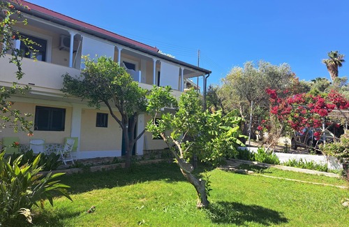 En una hermosa ubicación en la ladera, rodeada de olivares, sobre la playa de arena fina de Peroulia se encuentra la hermosa propiedad MAREMA. Los 3 apartamentos están uno al lado del otro, cada uno con su propia entrada exterior. Los apartamentos del sótano subyacente son utilizados por la familia de propietarios. La propiedad MAREMA está rodeada por una hermosa y cerrada propiedad de jardín, cubierta de plataneros, cítricos y numerosas plantas y flores mediterráneas. El césped en el patio delantero está disponible para todos los invitados juntos.