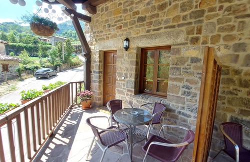 Este apartamento cuenta también con una terraza con mobiliario de jardín y vistas a la montaña.