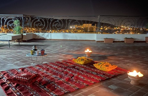 Gran terraza en la azotea con una increíble vista panorámica del océano y estas olas, las montañas del Atlas y el valle de Aourir.
