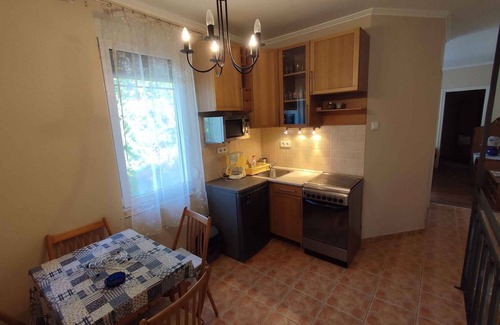 Apartamento vacacional cerca de la playa con wifi Su alojamiento turísticoEl apartamento vacacional está rodeada por un cerrado terreno de jardín o (400 m²) con prado, árboles, flores y arbustos. El terreno está rodeado de una valla. El propietario vive constantemente en la casa o (con entrada privada). Hay más apartamentos de vacaciones en la casa. Para uso común a su disposición: césped, muebles de jardín y barbacoa. Su apartamento turístico1 planta, 2 habitaciones (de los cuales 1 dormitorio), 35 m², 4 personas. Entrada por una escalera interior a la cocina. Dormitorio con 1 cama doble. Salón/dormitorio con 2 camas adicionales en sofá-cama y televisión. Cocina americana con zona comedor (4 plazas), cocina de gas (4 fuegos), horno, lavavajillas, nevera (congelador), microonda, cafetera y acceso al balcón. Baño con ducha, 1 lavabo, inodoro y ventana.Otras instalaciones: acceso de internet (WLAN). Recepción televisiva vía satélite. Animal domésticono se permite. UbicaciónSiófok. El apartamento vacacional moderno se encuentra en una urbanización de casas vacacionales y en una soleada ubicación. El acceso se realiza por una calle secundaria (asfaltado). Aparcamiento en la propiedad (para 1 coche). Compras 200 m, restaurante 200 m, centro de la localidad 3,3 km. piscina cubierta en Siófok 900 m. En el veranoBalaton con playa 200 m en Siófok. Paseo marítimo 1200 m, 1700 m Plázs playa. Sauna, jacuzzi 100 m del hotel Magistern ****. Condiciones y preciosEn el precio incluidoacceso de internet, estacionamiento, electricidad, gas, agua, limpieza final, ropa de cama, WLAN acceso de internet. Costes adicionales-Suplementos(Pagable en el momento de la reserva)/póliza de turismo.Fianza:50 Euro
