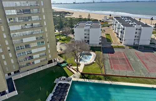 Este acogedor alojamiento en El Puerto de Santa María se encuentra en una ubicación privilegiada, ¡en primera línea de playa! Perfecto para disfrutar del mar y el sol en familia, cuenta con una piscina comunitaria. Además, dispone de una zona de juegos para niños y una pista de tenis para los amantes del deporte.