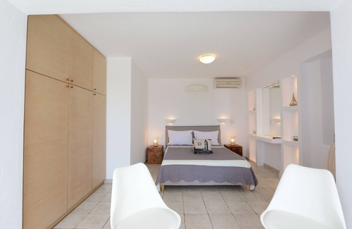 Estudio de estilo myconiano con moderno diseño de baño. Increíble vista al mar desde su propia veranda privada. Fácil acceso desde el aparcamiento y acceso wifi gratuito.