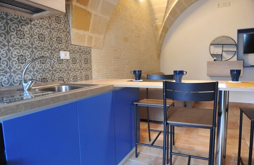 El más íntimo y acogedor de nuestros apartamentos. El apartamento Mar Piccolo consta de una entrada con zona de cocina, un dormitorio cómodo y un baño funcional con ducha. Techo de piedra abovedado característico, construcción arquitectónica típica de Salento, un sello distintivo de nuestra tierra.