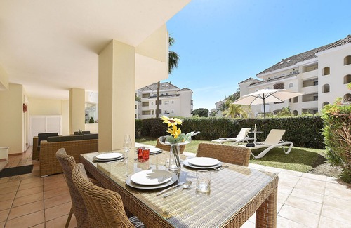 Este lujoso apartamento de dos dormitorios con piscinas subtropicales y piscina para niños se encuentra en el Resort Hacienda playa junto a la playa en Elviria - Marbella en la Costa del Sol en España. Hacienda playa Costa del Sol. El hermoso apartamento está situado en el lujoso complejo Hacienda Playa, situado en una de las más bellas playas de Marbella. Los apartamentos están rodeados de jardines tropicales con dos piscinas grandes y una piscina para niños. El apartamento está en la planta baja y cuenta con una gran terraza, parcialmente cubierta de 72m2, seguido de un jardín privado con acceso al jardín comunitario con piscina subtropical y piscina para niños. En las terrazas alrededor de la piscina hay tumbonas de uso gratuito. El apartamento tiene un salón con zona de estar y comedor y puertas corredizas a la terraza. Hay 2 amplios dormitorios, ambos con puertas correderas a la terraza, 2 baños y una cocina moderna totalmente equipada con todo el equipo necesario. Todas las habitaciones cuentan con aire acondicionado frío / calor. Hay WiFi INTERNET GRATUITO.