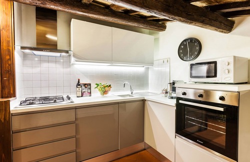 Los interiores de los apartamentos son amplios, amueblados con cuidado y muy luminosos desde la mañana hasta la tarde. De particular interés son las vigas del techo expuestas y el piso de baldosas de terracota que hacen que este apartamento sea único.