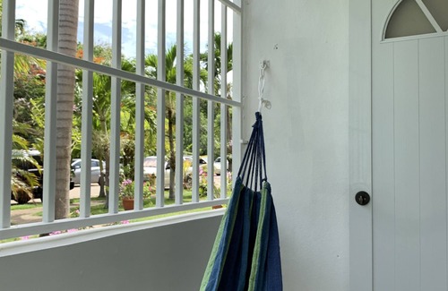 Apartamento entero, ubicado en un primer piso en complejo de condominios. Una habitación completamente amueblada con cama queen, aire acondicionado en la habitación, ducha con agua caliente, espacio para juego de mesa, sala espaciosa tiene futón para uno o dos huéspedes (un adulto o dos niños), Roku TV 32’’ en la sala (no hay TV en la habitación), comedor, cocina y balcón con hamaca. Tiene WiFi, secador de cabello, hornilla eléctrica, utensilios de cocina, cafetera, nevera, microondas, plancha para ropa, entre otros. El apartamento cuenta con un sistema de cisterna de agua de 60 galones, en caso de que el servicio de acueductos sea interrumpido, seguirá habiendo agua en el apartamento.