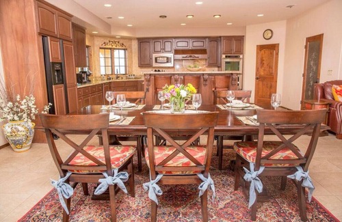 La cocina está totalmente cargada con encimeras de granito, una estufa Wolf 6, hornos dobles grandes, microondas, horno tostador y despensa. Una gran isla de 8 pies de largo crea el espacio perfecto para reunirse y hacer recuerdos con sus seres queridos mientras preparan una comida juntos. La isla al aire libre funciona como un bar incorporado para sentarse y conversar con su chef favorito y disfrutar de charcutería y una copa de vino. Te invitamos a entretener y partir el pan con tus amigos y familiares en nuestra mesa de comedor con capacidad para 8 personas, y disfrutar de las vistas de 20 millas a través de las puertas dobles que salen del comedor mientras el sonido de la música y la risa llenan la casa.