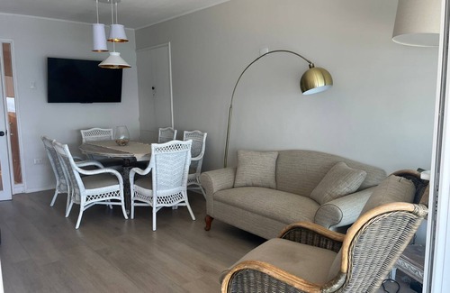 Este departamento esta recién remodelado, todo nuevo , con una gran terraza para que disfrutes con los tuyos, equipado para 8 personas, ubicado justo frente al la Avenida Perú en primera línea de la costa, a minutos del Casino de Viña del Mar, Mall Marina Arauco, locomoción colectiva, supermercados, restaurantes y pubs. El departamento cuenta con lavadora , cocina totalmente equipada, sabanas y toallas.