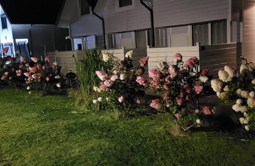 One of Baba Yaga Cottage's unique features is the enchanting evenings when dusk falls. Solar lamps placed around the cottage illuminate the garden, particularly highlighting the white and pink hydrangeas, creating a beautiful view against the evening sky. Coupled with the sounds of nature, especially the wind, guests can even hear the distant sound of the sea, adding to the cottage's special charm and creating the perfect atmosphere for peaceful relaxation.