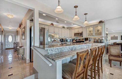 La UNIDAD # 6 está bellamente decorada con MATERIALES, MUEBLES, OBRA DE ARTE ORIGINAL Y ACCESORIOS DE PRIMERA LÍNEA, incluidos todos los electrodomésticos de cocina de acero inoxidable de última generación (que incluyen un refrigerador de 30 pies cúbicos de puerta francesa con agua y dispensador de hielo, horno y estufa de tamaño completo, lavavajillas y microondas), gabinetes de cocina personalizados con cajones de cierre lento e iluminación de acento arriba, abajo y adentro, tales como gabinetes de cocina, gabinetes de baño y espejos personalizados, encimeras de granito en todas partes, varios artefactos de cristal Schonbeck, tres inodoros Kholer Devonshire, un nuevo aire acondicionado, un nuevo calentador de agua caliente de 80 galones, dos camas de hierro forjado Wesley Allen de primera línea en cada una de las dos habitaciones, una Cama de hierro forjado tamaño queen Wesley Allen de primera línea en un tercer dormitorio, junto con un conjunto de literas de madera "completas sobre completas", una mesa de comedor con cómodos asientos para 8 o más, y una isla que puede acomodar cómodamente al menos 4 más en b ar taburetes con respaldo, molduras de techo, gres porcelánico (con aspecto de mármol), muebles de cuero muy cómodos (una gran sección y dos sillas adicionales). Las encimeras de granito en la Unidad # 6 son de grado 2 (grado más alto de lo normal), y los pisos de porcelanato claro, que incluyen "caídas", tienen un aspecto de mármol.
