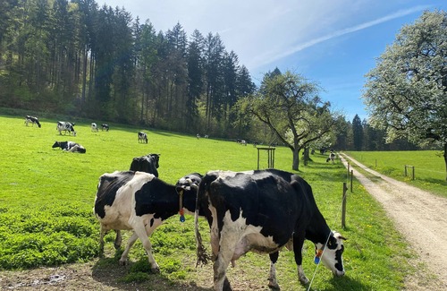 Take the whole family to this fantastic accommodation in Überlingen-Bonndorf on Lake Constance. Surrounded by forests and fields, Helchenhof is also home to cows, chickens, horses, and cats. For excursions in the surrounding area, there are inviting beaches and outdoor pools, the Mainau Island, Lake Constance boat trips, the Rhine Falls, the Monkey Hill, Lake Constance Thermal Bath, pile dwellings, a petting zoo, and a tractor museum. The Lake Constance cycle path or the premium hiking trail leave nothing to be desired for sports enthusiasts.