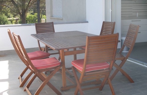El apartamento está en el primer piso de un dúplex recientemente reformado, está situado a menos de 150 m del mar. Consta de sala de estar / cocina; cuarto de baño con ducha, dos dormitorios, uno doble y otro con dos camas individuales, una gran terraza cubierta en el lado mar y una pequeña terraza que se accede desde los dos dormitorios.