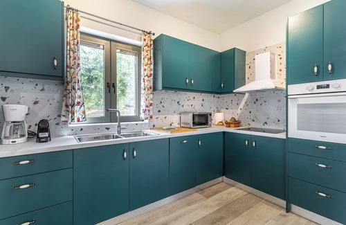 Esta casa de vacaciones de 3 dormitorios y 2.5 baños se encuentra en West Mani y es una ubicación fantástica desde la que recorrer los alrededores. A los amantes de la naturaleza y el aire libre les encantará estar a 3min en coche de Playa Pantazí y a 2min de Mar Jónico. Si quieres explorar la zona, estarás a 9min en coche de Playa de Stoupa y a 9min en coche de Kalogria.