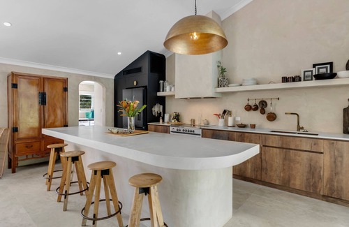 Belle Escapes presents this Mediterranean-inspired coastal escape, walking distance from the tranquil shores of Clifton Beach. Set back from the road for privacy, the entry features Moroccan terracotta tiles and an oak door with Balinese brass handles, setting the tone as you step through into a haven of eclectic, contemporary style. With soaring ceilings, earthy, textured walls, beautifully curated furnishings, and unique detailing like aged brass and copper accents and faded blue mosaic tiles, the carefully chosen elements come together to create a low-key, sophisticated environment. The layout comprises generous open plan living, multiple hideaway spaces to read or enjoy some solitude, and three spacious bedrooms, including a stunning King master suite with a gorgeous outdoor bath. The kitchen invites relaxed dining and entertaining, with organic finishes, aged brass tapware, copper pots, and modern accoutrements delivering a stylish, “modern rustic” vibe. The interiors flow out to the al fresco entertaining area through banks of glass doors in an effortless indoor/outdoor aesthetic, providing a wonderful connection to the tropical gardens, pool and sun deck - all set against a lush, private backdrop.