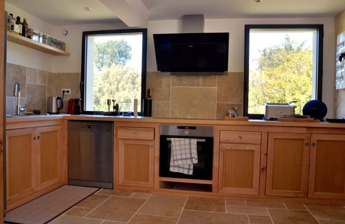La cocina está totalmente equipada con equipos nuevos: nevera americana, vitrocerámica grande, horno, escritorio y cómoda encimera.