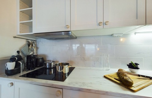 La cocina está equipada con placa de cocina, frigorífico y lavavajillas, además de cafetera y tetera, microondas y utensilios de cocina. Y hay acceso a una lavandería, de modo que necesitarás poco equipaje. Otras comodidades incluyen una tabla de planchar, calefacción, servicio de limpieza limitado y una mesa de comedor.