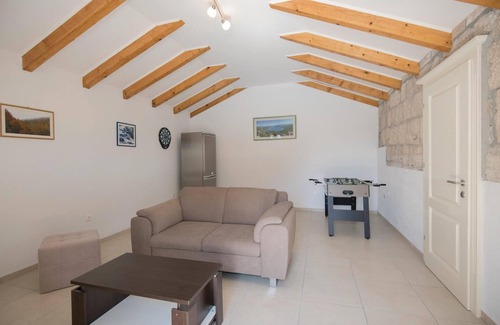 Pase sus vacaciones en el campo en esta casa tradicional de piedra con piscina. La planta baja con la taberna tiene una entrada independiente y está conectada a la primera y segunda planta por escaleras exteriores. También hay escaleras interiores que llevan de la primera a la segunda planta. Relájese en la terraza con piscina frente a la segunda planta, donde también se encuentra la sala de recreo. Al lado de la casa está la terraza con barbacoa y vistas a los viñedos. Delante de la casa hay una carretera de tráfico y enfrente hay un aparcamiento. Imotski está a unos 7 km y a las hermosas playas de guijarros en Makarska se necesitan unos 20 minutos en coche.
