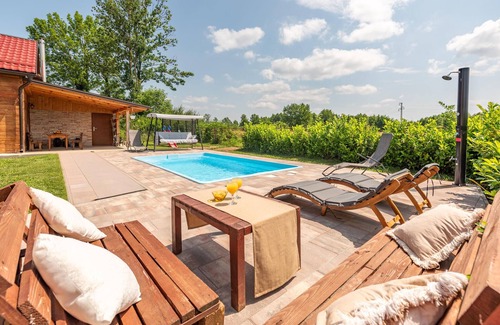 Escondida en la idílica campiña croata, le espera esta casa de madera diseñada con mimo. Con su moderno diseño, elegantes habitaciones y mobiliario de buen gusto, es el refugio perfecto. El acogedor salón con chimenea invita a pasar veladas relajantes, mientras que la cocina bien equipada es ideal para cocinar juntos.