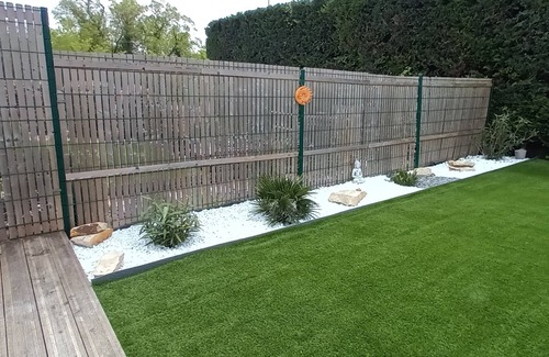 Casa nueva con una gran sala de estar muy luminosa que se abre a una terraza de madera alrededor de la casa. Cocina americana totalmente equipada con isla central. 2 bonitas habitaciones con cama de matrimonio y armario integrado, 1 de ellas con vistas a la terraza. Un baño con bañera, 2 lavabos y 1 ducha a ras de suelo. Una bodega con lavadora, secadora y congelador. La casa también tiene un garaje para guardar bicicletas si es necesario. Estarás a 15 minutos de La Rochelle y a 20 minutos del puente Ile de Ré. La ciudad tiene una tienda de comestibles abierta todos los días y los domingos por la mañana, así como un supermercado a 5 minutos.