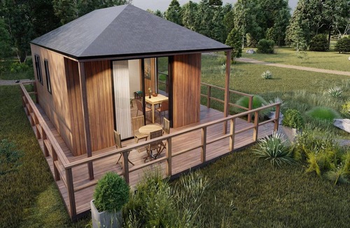 Distribución: Planta baja: (salón(TV), cocina abierta(tetera, microondas, nevera(+ congelador)), dormitorio(cama doble), cuarto de baño(ducha, lavabo, váter)) terraza(cubierta), jardín, muebles de jardín, aparcamiento, piscina(compartido con otros huéspedes, exterior, cubierta)