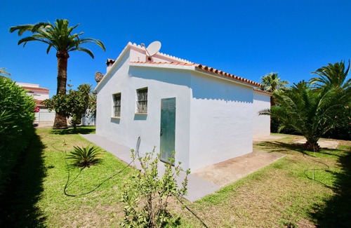Bonita villa en Denia a tan sólo 150m del mar. El terreno de 600 m2 está totalmente vallado. El jardín posee gran variedad de plantas, palmeras y césped. La piscina tiene 7x4 m con escalera romana con una profundidad máxima de 1.80m y mínima de 1m y ducha exterior. Se accede a la vivienda a través de una terraza cubierta con mobiliario de jardín.