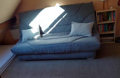 Un altillo con un sofá, una cama supletoria y cuna. Los edredones y 220x240