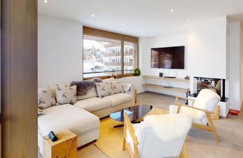 The 3 1/2 room apartment can accommodate up to 5 people. The apartment on the 3rd floor has a living room with dining area and open kitchen. Enjoy the fresh mountain air on the balcony. One bedroom has a double bed (180x200 cm) and the second bedroom has two single beds (90x200 cm). 2 wet rooms with bath/toilet, shower/toilet and a washer-dryer are available. In the modern kitchen you will find a dishwasher, oven, microwave, Nespresso machine, raclette and fondue dishes. The living room also has a sofa bed (140x200 cm) and a fireplace for cozy evenings.