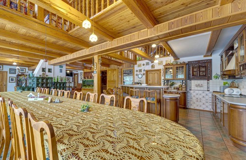Casa 8 estancias 750 m2 en 3 plantas. Con mobiliario de buen gusto: salón-comedor 85 m2, abierto con chimenea. Cocina abierta (4 fogones, horno, lavavajillas, microondas, cafetera eléctrica). En planta inferior: sala de juegos 70 m2, abierta. Salida a la piscina. Baño/WC, WC separado. Planta superior: altillo abuhardillado, abierto con TV satélite, vídeo y DVD. 2 dorm abuhardillados, cada habitación con 2 camas. Salida al balcón. 2 dorm abuhardillados, cada habitación con 1 sofá-cama doble (120 cm). Salida al balcón. 1 dorm abuhardillado con 2 camas. 1 dorm abuhardillado con 1 sofá-cama doble (120 cm). 1 dorm abuhardillado pequeño con 1 cama. 4 ducha/WC. 2 balcones, terraza 160 m2. Muebles de balcón, barbacoa. El alojamiento dispone de: cuna hasta 5 años. Internet (Wifi, gratis). Plaza de aparcamiento junto a la casa. La casa es adyacente a la del propietario. Atención: sólo se aceptan grupos de jóvenes bajo petición - solo se aceptará bajo confirmación del propietario, en este caso la fianza será de 5000 PLN. Los grupos que no hayan sido previamente confirmados no serán aceptados. En lugar de un dormitorio cerrado, algunos espacios para dormir están situados en una zona diáfana (galería, alcoba, etc.).