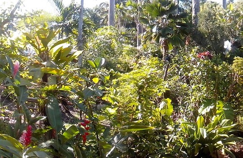 El jardín de 2000 m2, con una densa vegetación tropical contiene una colección de más de 400 especies de orquídeas y muchas otras plantas: el cacao, el café arábica, pimienta, rosas de porcelana, madera de la India, etc ...