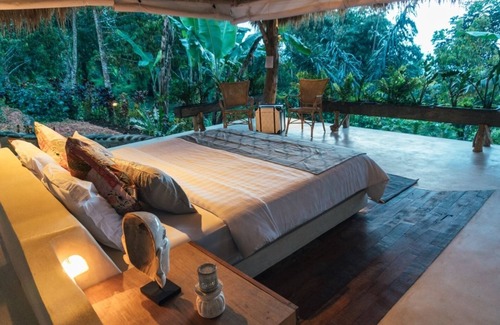 Cabaña abierta natural de 1 habitación con una suite jungla sin paredes al aire libre ubicada en los brazos de la naturaleza, que se completa con una cama king size y un baño abierto que cuenta con una bañera de cobre, área de ducha, agua fría y caliente y vistas a la hermosa vegetación. y vista panorámica.