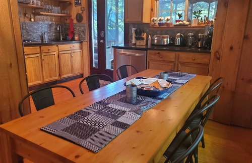 Cocina campestre totalmente renovada y totalmente equipada con encimeras de granito, salpicaduras de pizarra, electrodomésticos de acero inoxidable de primera calidad: lavavajillas, microondas, cocina de gas de 5 quemadores y horno separado, refrigerador con máquina de hielo. También hay una lavadora / secadora.