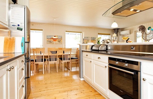comedor, cocina(fogón(eléctrico), cafetera, microondas, lavavajillas, congelador(60-99L), nevera con congelador , secadora, lavadora), salón-dormitorio(25 m2)(TV(satélite, canales de televisión alemanes, canales de TV daneses), reproductor de DVD, instalación estéreo), dormitorio(cama doble), dormitorio(cama doble), dormitorio(2x cama individual), cuarto de baño(calefacción de suelo)(bañera o ducha, lavabo, váter), cuarto de baño(calefacción de suelo)(bañera o ducha, lavabo, váter), aparcamiento cubierto , Bañera de burbujas(dentro de la casa), sauna(dentro de la casa, climatizada), calefacción(radiador(es) eléctrico(s)), terraza(cubierta), muebles de jardín, mesa para limpiar el pescado, bomba de calor aire-aire
