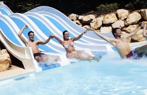 Parque acuático: piscina al aire libre con piscina infantil, tobogán múltiple, solarium, acceso gratuito