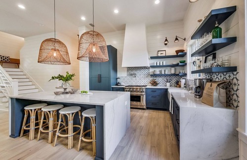 Los interiores amplios y luminosos crean una bienvenida refrescante para los huéspedes que ingresan a esta casa. Un plano de planta amplio y de concepto abierto brinda un flujo maravilloso al primer nivel y se une a las áreas de cocina, comedor y sala de estar. La cocina gourmet es un paraíso para los cocineros caseros y cuenta con hermosos gabinetes azul marino personalizados, amplias encimeras de color blanco brillante, estanterías superiores abiertas y electrodomésticos de acero inoxidable de alta gama. La gran isla en cascada ofrece asientos para ocho personas, y el área de comedor cercana ofrece un lugar cálido y acogedor para disfrutar de una comida costera fresca. Disfruta de una noche de cine en la acogedora sala de estar que ofrece amplios asientos y un gran televisor de pantalla plana montado. La luz natural inunda el primer nivel a través de las ventanas del espejo de popa, y las puertas francesas conducen al porche protegido. También en este nivel hay dos hermosas habitaciones: la espaciosa suite principal, que cuenta con una cama king y un baño privado con ducha y bañera con frente de vidrio, y una habitación con cama king y baño privado con ducha con frente de vidrio.
