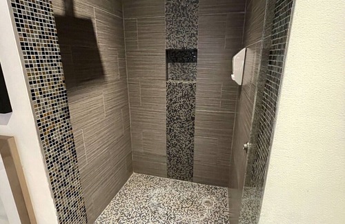 El baño de hidromasaje siente tiene un gran paseo de baldosas en la ducha, y un contador de tocador grande para todas sus comodidades.
