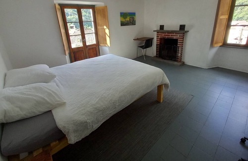 This single room with private shower en suite and private toilet in the hallway has a fireplace, 3 large original chestnut wood windows and a small balcony with great views over the valley. Very cozy, light and airy.