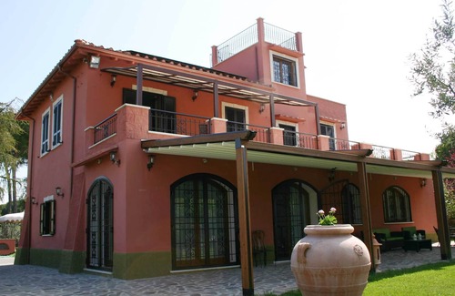 Situado en el entorno mágico de Frascati, a pocos pasos de la capital y de la estación de metro de Anagnina, el aeropuerto de Ciampino y G. R. A. Esta casa de campo de principios del '900 completa un pedazo de paraíso enclavado en el verde, con su parque, la piscina y terrazas con vistas a Roma ya los Castelli Romani.