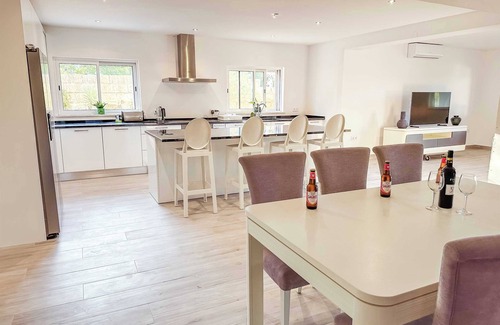 Bring the whole family to this great place with lots of room for sun and relaxation. Welcome to Casa Da Cisterna, a recently refurbished large luxury 7-bedroom villa in Alvor in the Algarve, a short drive from Portimão. Nestled amidst natural beauty and surrounded by lush greenery, this villa offers the perfect blend of luxury, comfort, and tranquillity. As you approach the villa, you are greeted by charming Mediterranean architecture, featuring white walls and terracotta roof tiles, The beautifully landscaped garden invites you to explore and enjoy the peaceful surroundings. Upon entering the villa, you step into a spacious open plan living area that sets the tone for the entire property. The interior has been designed with a contemporary aesthetic with modern elements. The open-concept living area is bathed in natural light, thanks to large windows/doors that offer stunning views of the garden and swimming pool. There are two living rooms and are tastefully furnished with plush sofas, stylish armchairs, and flat screen TV, creating an inviting space for relaxation and socialising. Adjacent to the living room, you'll find a dining area where you can savour delicious meals with family and friends. The villa boasts a fully equipped kitchen, featuring state-of-the-art appliances, sleek cabinetry, and ample counter space. This kitchen provides the perfect setting for culinary adventures. The five spacious bedrooms have been designed with your utmost comfort in mind. Each room exudes an atmosphere of serenity and sophistication, with luxurious furnishings, comfortable beds, and ample storage space. Kitchen • 2 ovens • Microwave • Fridge freezer with filtered water and ice dispenser • Iron and ironing board • Double sink • Kitchen island • Ample cupboard space • Full cooking utensils, pots, pans and crockery No dogs, no smoking Master Bedroom An impressive master bedroom with king size bed, quality mattress, dressing area with tables and wardrobes and large bathroom with walk in shower and bath and separate toilet area. There is an entire terrace with views to the garden, pool area, ocean in the distance and landscaped gardens. En-suite Bedroom A generous bedroom fitted with king size bed, dressing table and walk in shower & toilet. Large bedroom A large bedroom with dressing area and king size bed & neighbouring toilet and walk in shower. Twin bedroom 1 Large bedroom with 2 single beds and separate toilet Twin bedroom 2 Large bedroom with 2 single beds and separate toilet. Second floor 2 double bedrooms with shower room and toilet. Garden Sunbeds Tables and Chairs The beautifully landscaped garden features a sparkling swimming pool surrounded by sun loungers, where you can unwind and soak up the sun. A covered outdoor dining area provides the perfect setting for al fresco meals and gatherings. Alvor is a picturesque coastal village located in the southern region of Portugal known as the Algarve. Alvor is nestled on the estuary of the Alvor River and enjoys a stunning natural setting. One of the main attractions of Alvor is its beautiful beaches. The village boasts a long sandy beach, known as Praia de Alvor, which stretches for several kilometers along the coast. Additionally, the estuary area provides opportunities for water sports such as windsurfing, sailing, and kayaking. Alvor's charming town center features traditional whitewashed houses, narrow streets, and a relaxed and laid-back atmosphere. The village has retained much of its authentic character, with a mix of fishing village traditions and modern amenities. Nearby towns such as Portimão and Lagos offer additional attractions, including historic sites, museums, and bustling markets. Overall, Alvor is a charming coastal village that combines natural beauty, cultural heritage, and a relaxed atmosphere. It is a popular destination for those seeking a peaceful seaside getaway with plenty of opportunities for outdoor activities and exploration. The whole property