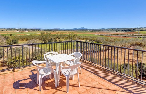 En el este de Mallorca, enclavada en el bucólico e increíble paisaje al norte de la pequeña ciudad de Petra, se sitúa Finca Campas, una propiedad equipada para hospedar hasta 8 personas. Siguiendo una temática de estilo rústico y construida con piedra natural, esta casa cuenta con 2 plantas entre las cuales se ubican un amplio salón-comedor con altos techos, una chimenea y un sofá, una moderna y bien equipada cocina con un gran frigorífico, 4 dormitorios (3 de ellos con camas dobles y uno con una cama individual), así como 3 baños y un aseo. Entre las comodidades adicionales de este perfecto oasis de tranquilidad se incluyen una televisión, ventiladores, lavadora, Wi-Fi y barbacoa. Podrás empezar la jornada en el exterior, disfrutando del café en los muebles de jardín, y en la terraza, tumbonas y una sombrilla te aguardan para que descanses después de un chapuzón en la piscina de 18 m² (sin sistema de climatización). Además, podrás terminar el día en el balcón mientras disfrutas de unas vistas privilegiadas de los naranjos, olivos y del molino de viento que se encuentran en las inmediaciones. En el municipio de Petra, a unos 7 kilómetros (5 minutos en coche), encontrarás una amplia selección de tiendas, restaurantes, bares y un mercado semanal con productos frescos. La coqueta playa de arena de Son Serra de Marina está a tan solo 20 minutos en coche de la villa, donde podrás relajarte bajo el sol mediterráneo y dejar atrás la cotidianidad.