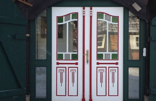 Se ha ampliado en 2015 como una casa de vacaciones con calefacción por suelo radiante. En el interior, el yeso de arcilla está pintado de amarillo soleado. Está decorado de forma elegante con persianas de estilo romano de estilo antiguo con inserciones de encaje y una vieja estufa de hierro adornada de ladrillo que se usa como chimenea.