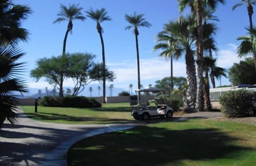 El campo de golf en el Indian Palms Country Club es hermoso y, sin embargo, una ronda de golf es muy asequible. Puedes caminar desde la casa hasta el lugar de salida. El garaje es lo suficientemente grande para dos autos y un carrito de golf.