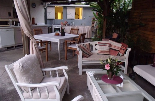 La terraza incluye un área de cocina, una mesa de comedor, una sala de estar al aire libre. Con todo el equipo, puede cocinar / calentar sus platos, o compartir las comidas tradicionales de Reunión preparadas por nosotros. Cafetera, tetera, microondas, lavavajillas, lavadora, aspiradora están a su disposición.