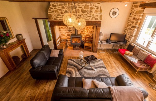 En la planta baja gran salón de 62m² con cocina abierta, mesa de granja, escalera central, sala de estar con chimenea (estufa de leña en la chimenea, leña incluida), suelos de madera, vigas de madera y piedras reconstruidas.